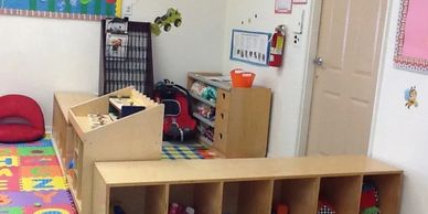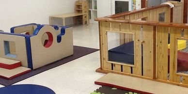 Our infant space design allows a caregiver to be cozy in the "corral" with vulnerable little babies, another to be in the larger area with the active crawler and cruisers, and another to supervise the sleeping infants.
