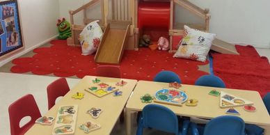 This space is for the older infant up to 24 months. They are having art experiences, and group time. Teacher directed activities designed to support large motor coordination, small motor skills, self help independence, and talking talking talking!